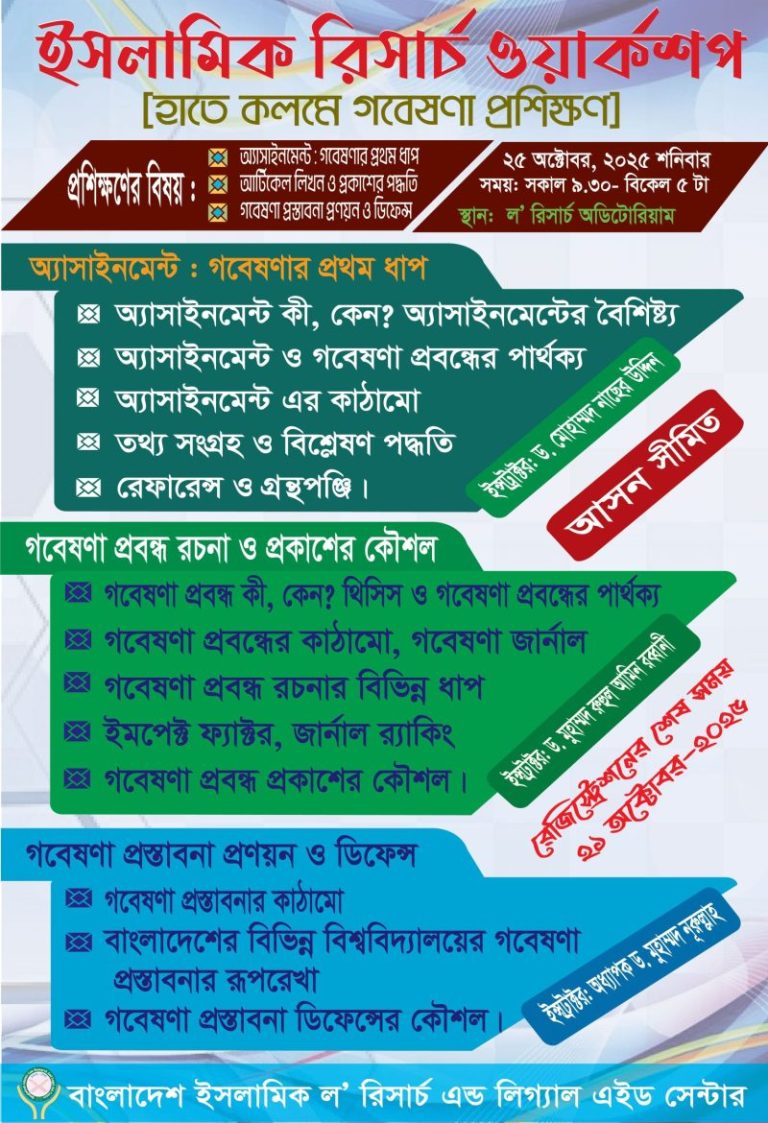 বাংলাদেশ ইসলামিক ল’ রিসার্চ এন্ড লিগ্যাল এইড সেন্টার-এর আয়োজনে নবীন গবেষকদের জন্য ইসলামিক গবেষণা পদ্ধতি বিষয়ক দিনব্যাপী কর্মশালা ইসলামিক রিসার্চ ওয়ার্কশপ (৩য় ব্যাচ) । তারিখ : ২৫ অক্টোবর-২০২৫। শনিবার (সকাল ০৯.৩০টা থেকে বিকাল ০৫.০০টা) পর্যন্ত। ভ্যেনু : ল’ রিসার্চ অডিটোরিয়াম, নোয়াখালী টাওয়ার, লিফ্ট-১২, পুরানা পল্টন, ঢাকা-১০০০